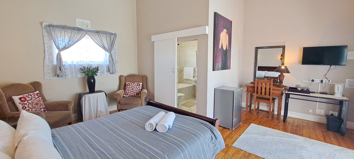 This Queen size bedroom with its mix of modern and antique style looks out at the sparkling Swimming Pool, en-suite bathroom with a separate bath and shower. The room comprises of a Smart Tv and Openview Decoder, Tea & Coffee facilities, Bar Fridge, white towels and comfortable seating.